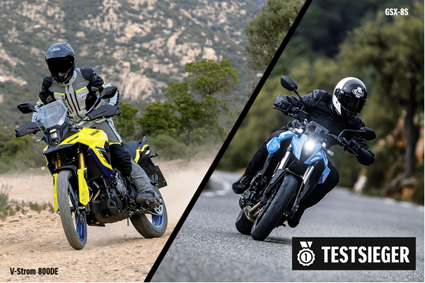 Die Saison ist in vollem Gange und zwei Suzuki Mittelklasse-Bikes sorgen gerade für ordentlich Gesprächsstoff. Die Suzuki GSX-8S und die V-Strom 800DE haben in aktuellen Vergleichstests souverän den ersten Platz erobert. Zwei völlig unterschiedliche Charaktere, aber beide mit einem echten Sieger-Gen.