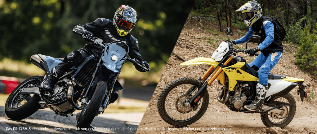 Die Legende ist zurück – und besser als je zuvor! Mit der brandneuen DR-Z4S für packende Abenteuer im Gelände oder der DR-Z4SM für den ultimativen Adrenalinkick auf Asphalt erlebst du pure Action, Dynamik und echtes Freiheitsgefühl in jeder Kurve.